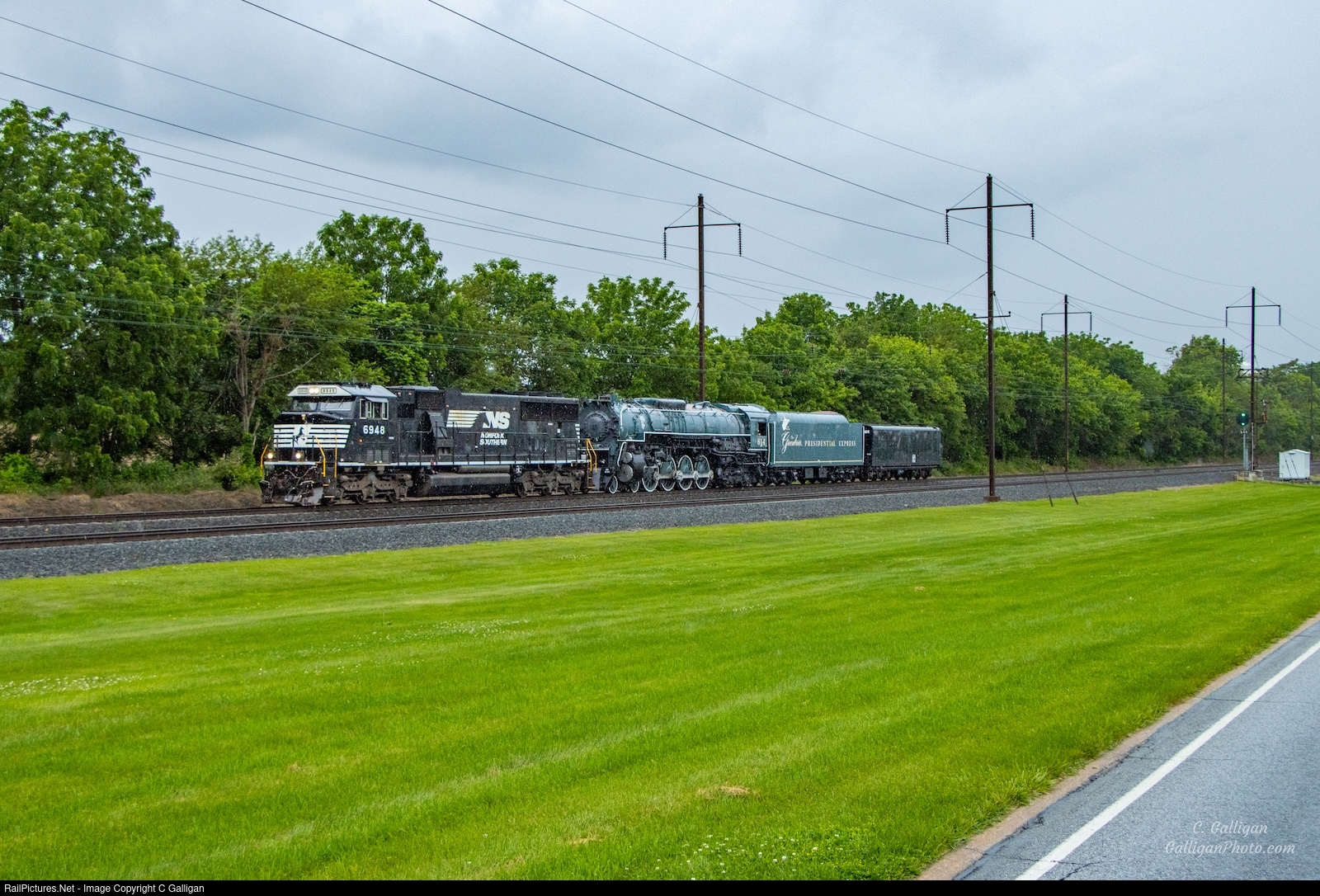 | The downpour has started as Norfolk Southern Special Move 068 makes their way across the Amtrak PH Line towards Leman Place to interchange the Chesapeake & Ohio 4-8-4 614 with the Strasburg Railroad. |