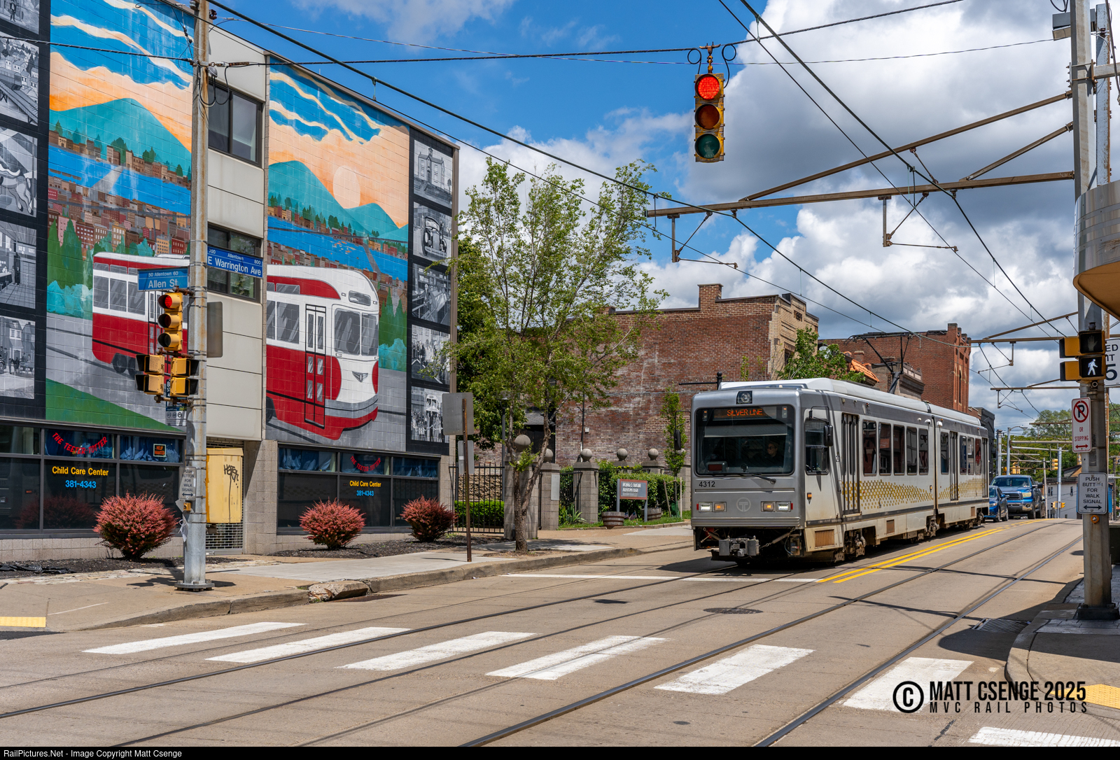 Light Rail Heritage. Pittsburgh Regional Transit (PRT) CAF LRV no. 4312 is seen stopped at Warrington Ave / Allen St while operating a Silver Line service to Library Station. The adjacent building features a mural showing a PCC car that formerly operated in the city.