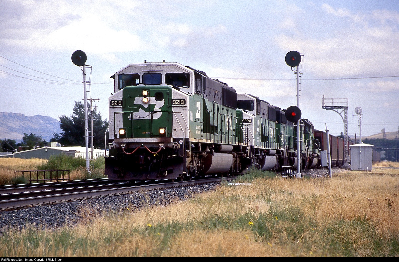 BN 9219 with another 60M and two SD40-2s roars past the NP-era signals protecting the west end of Livingston, MT as clouds build in a late August sky. The coal train is beginning the climb to Bozeman Pass and has five MRL SD40 and SD45s on the rear. Fuji Astia.