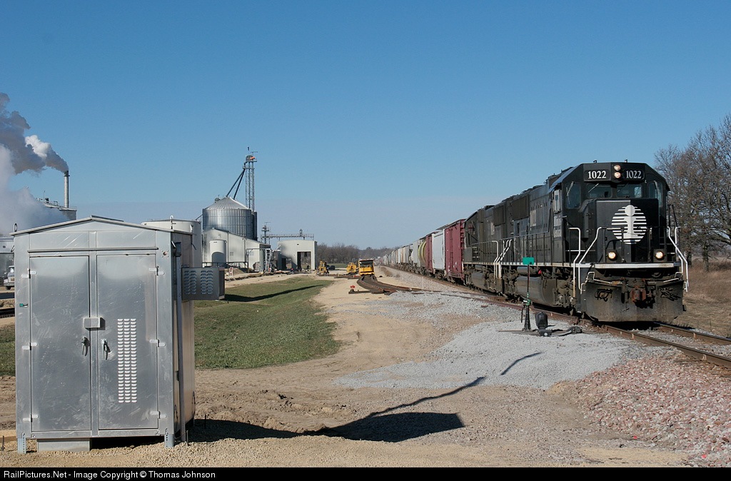 As the daily freight train from Waterloo, IA - Chicago, IL passes by, work continues on the new track which will allow the CNIC to serve the Adkins Energy Ethanol Plant.