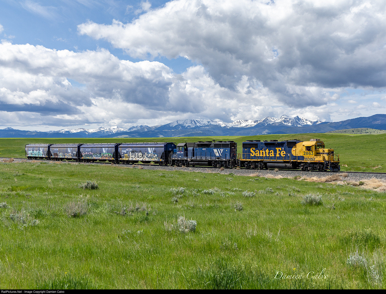 | BNSF 2863, a bluebonnet Santa Fe GP39-2 takes the 844 local by the Tobacco Root Mountains along 359. |