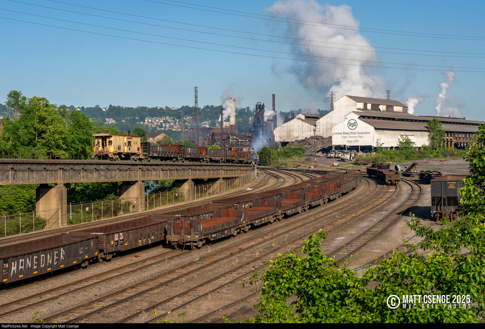 Union Railroad (URR) bay window caboose no. 104 is on the end of a long train pushing up the ramp out of the yard at the US Steel Co. Edgar Thompson Works. Once fully up the ramp, the train would change directions to pull across the Monongahela River. |