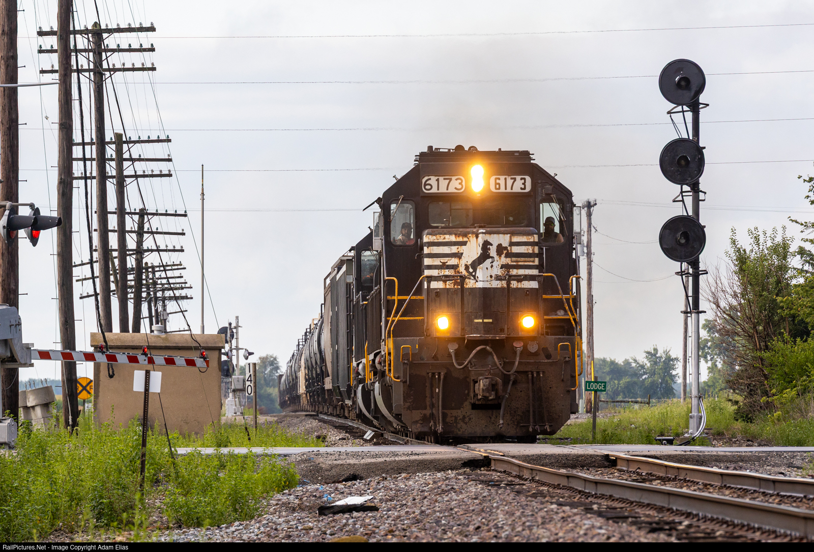 | NS 6173 heading North through a very cluttered scene in Lodge, Illinois. The subjects at least make this shot worth it. This was a great morning chase from Bement to Gibson City last July. |