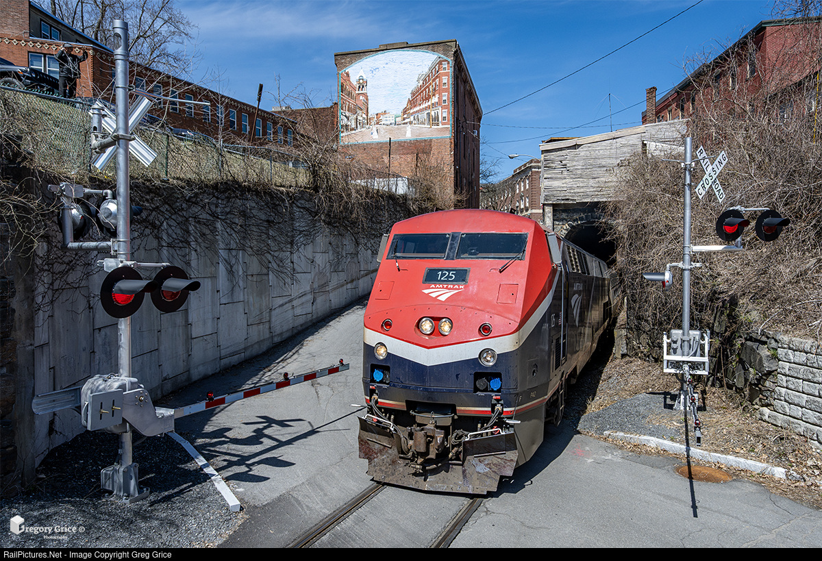 On April 14th, 2025, Amtrak P42DC #125, painted in Phase VII, leads southbound Vermonter Train 57 out of the tunnel and across Mill Street in Bellows Falls, Vermont on the NECR Palmer Subdivision.