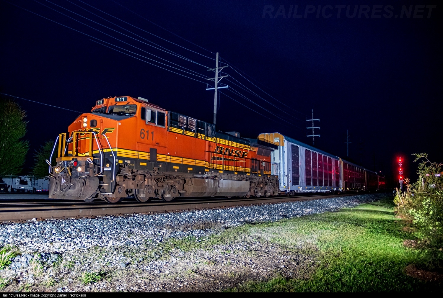 | BNSF 611, a former Warbonnet C44-9W now wearing the BNSF H3 "Swoosh" scheme, leads an auto train solo up the IHB mainline towards the CP 502 connection with the NS Chicago Line. |
