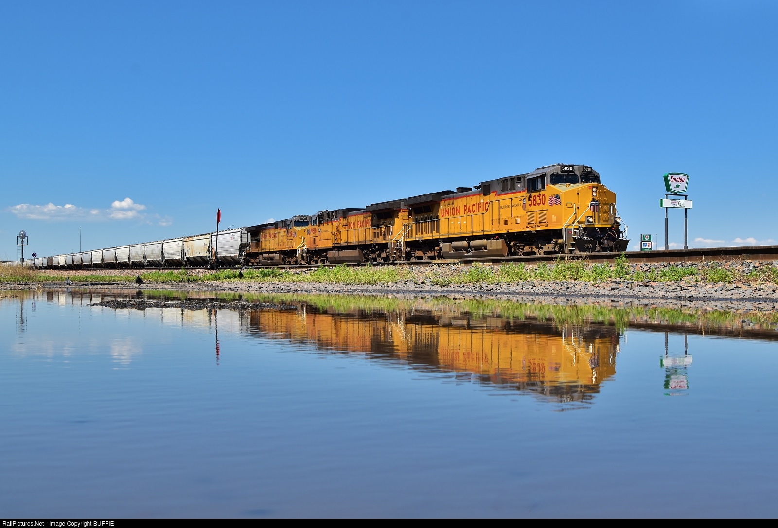 UP 5830 (ES44AC) runs past a puddle as it heads into the Cheyenne Yard.