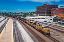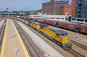 A UP Coal Train and BNSF Grain Train passes each other on the KCT Main by Union Station with a UP rebuild leading.