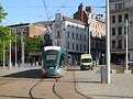 Nottingham tram No 224 arrives at Old Market Square in central Nottingham.