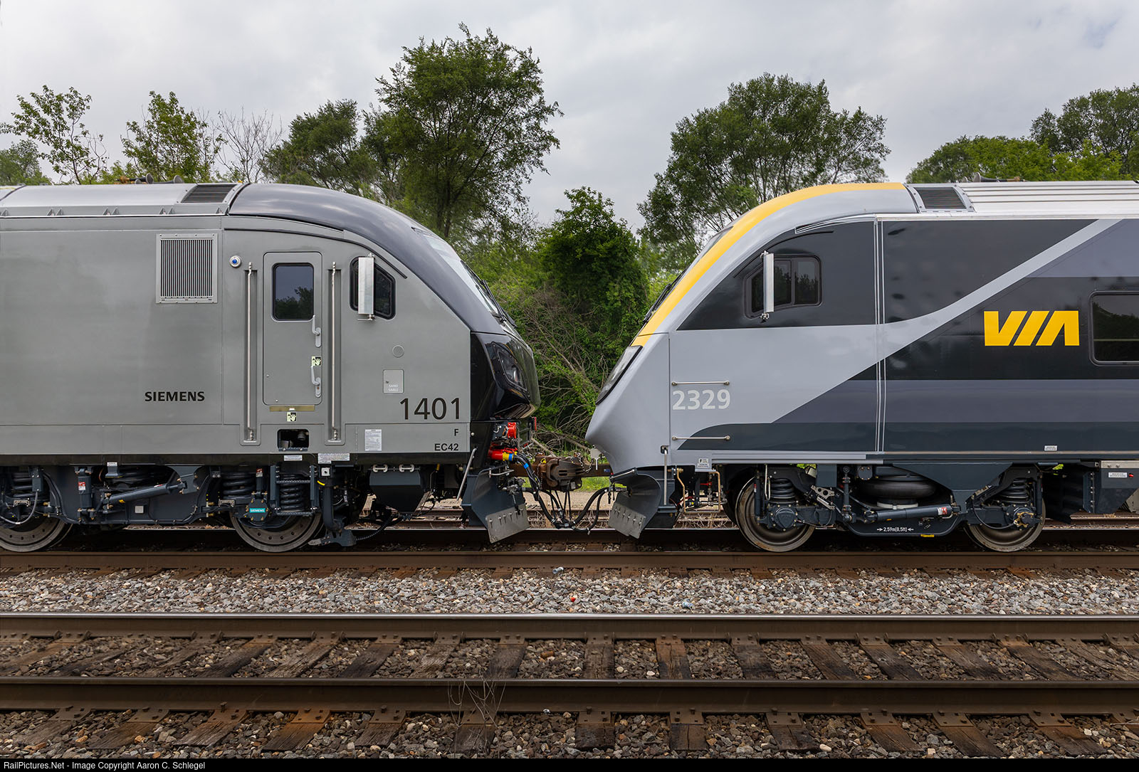 EXO 1401 sits nose to nose with VIA Rail 2329 Venture Cab Control Car as it makes its way to Montreal. The EXO 1401 was transported with the the Venture Trainset on CN P276.