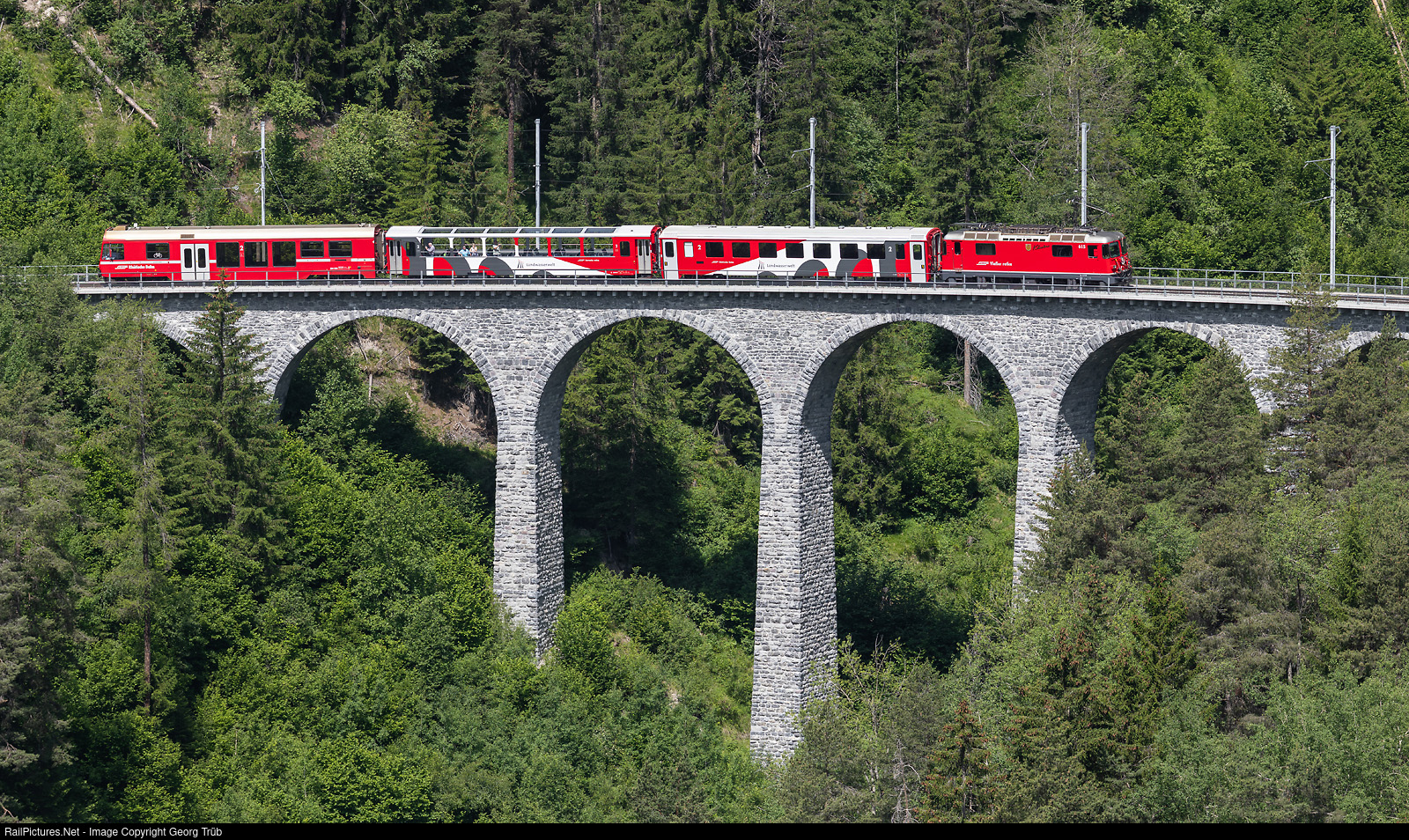 | This year, the new "Viaduktshuttle" train of the line R 28 circulates during the summer about every half an hour between Filisur and Alvaneu, with a stop at the new opened "Schmitten GR Landwasserviadukt" station. The push-pull train with a cab car BDt, the new open observation car B # 59401 with 60 seats, a second class car type II B # 2383 and a Ge 4/4 II locomotive (today # 615 "Klosters") is crossing the Schmittentobel viaduct next the new stop "Schmitten GR Landwasserviadukt". |