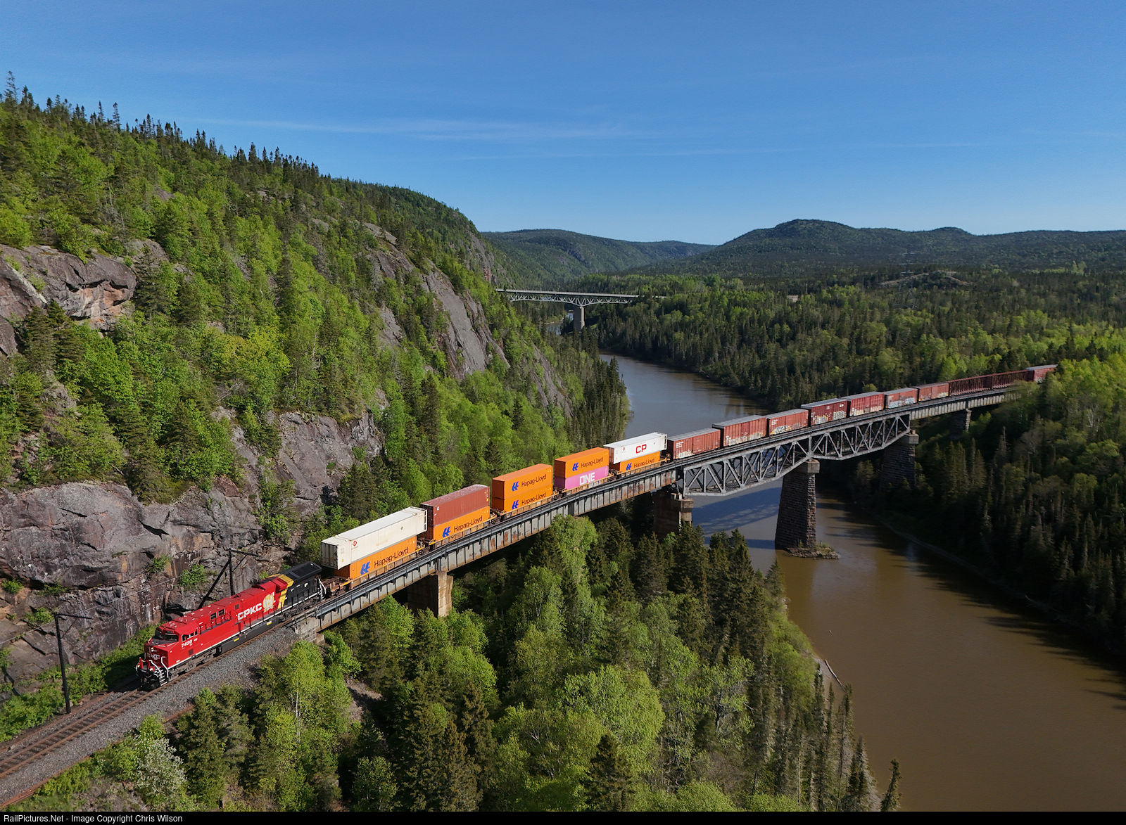 Toronto Yard, ON - Winnipeg, MB train 221 eases across the Little Pic River trestle at mileage 81 of CPKC's Heron Bay Subdivision.