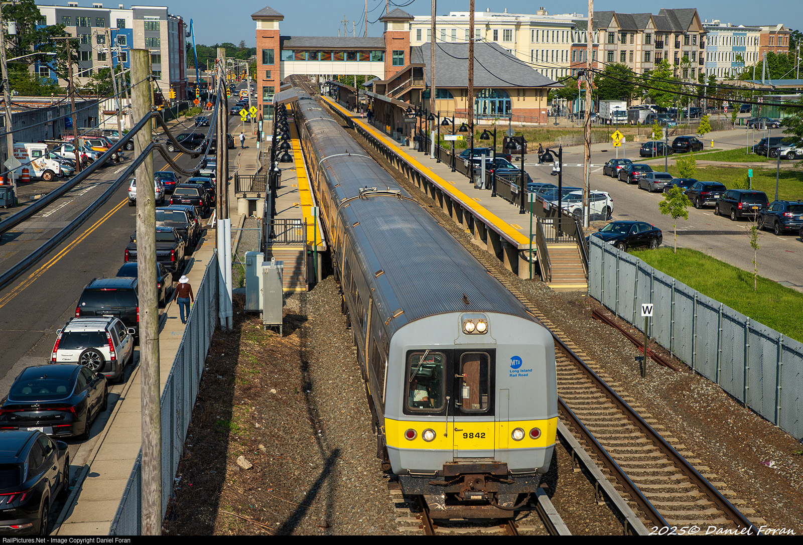 | One of the three morning deadheads to Ronkonkoma yard was a set of M3s so I ventured out to the pedestrian bridge by the Wyandanch station to photograph them passing. The view westward shows the revamped downtown area. |