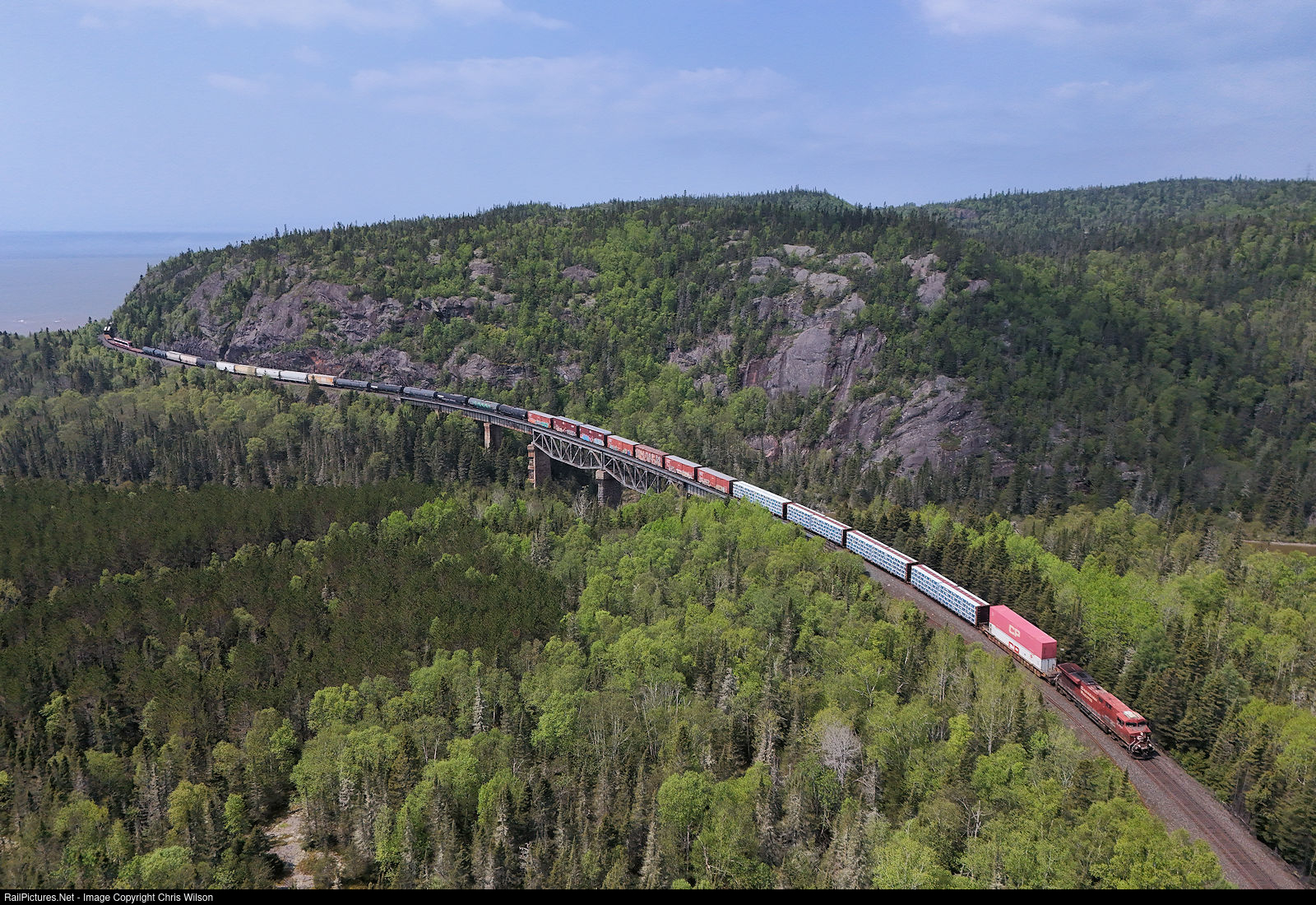 Train 420 from Winnipeg, MB - Toronto, ON snakes through Neys and over the Little Pic River trestle. Look closely and you will see a new TTC LRV from the Alstom plant in Thunder bay about 20 back.