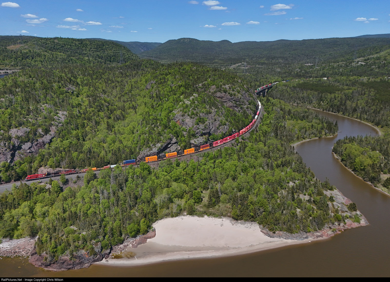 Everything is finally lush along the Heron Bay Subdivision north of Lake Superior after a long dragged out spring in Superior Country. Here at the mouth of the Little Pic River westbound hotshot intermodal train 101 from Toronto to Vancouver twists and turns through the rugged landscape.