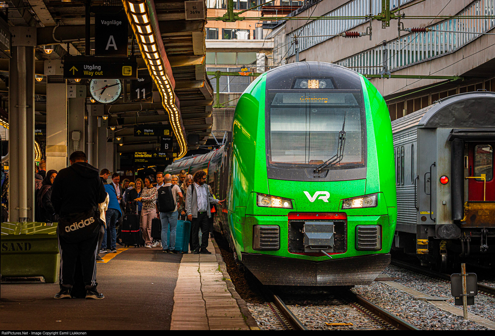 | VR's global empire is growing, as last year the Finnish state owned BR bought the Swedish based MTRX to itself, thus beginning to be responsible for high-speed trains operations between Stocholm and Gothenburg. Here, the shiny type X74 EMU belonging in the Stadler Flirt family of EMUs is rolling on the station platform of Stockholm central railway station, and soon the departure to Gothenburg shall commence. |