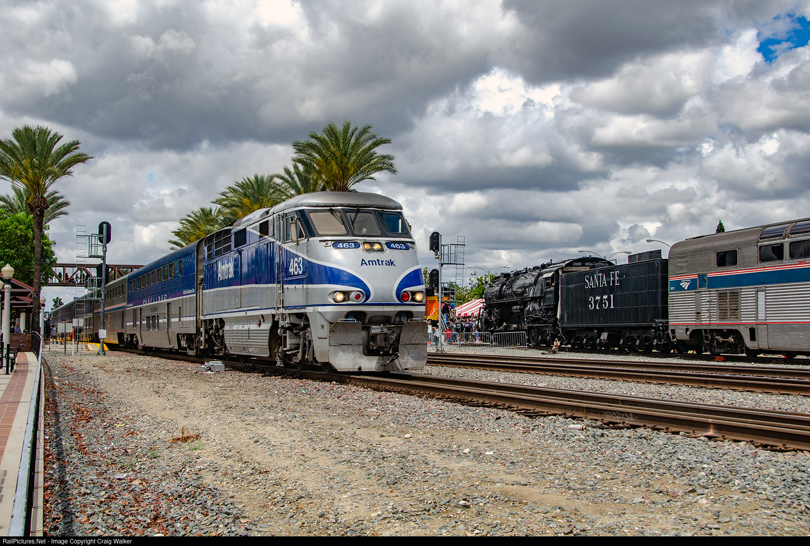 There is a big crowd on hand as Amtrak train 572, a Los Angeles to San Diego Pacific Surfliner, departs the Fullerton Transportation Center behind F59PHI 463. But the crowd is hear for the annual Fullerton Railroad Days event, which this year, as it almost all the others, includes a visit from the San Bernardino Railroad Society's former Atchison Topeka & Santa Fe 4-8-4 3751. Later this day, the 4-8-4 and the other display equipment from BNSF and Amtrak, will head back to Los Angeles. (Fullerton, California - May 5, 2017)