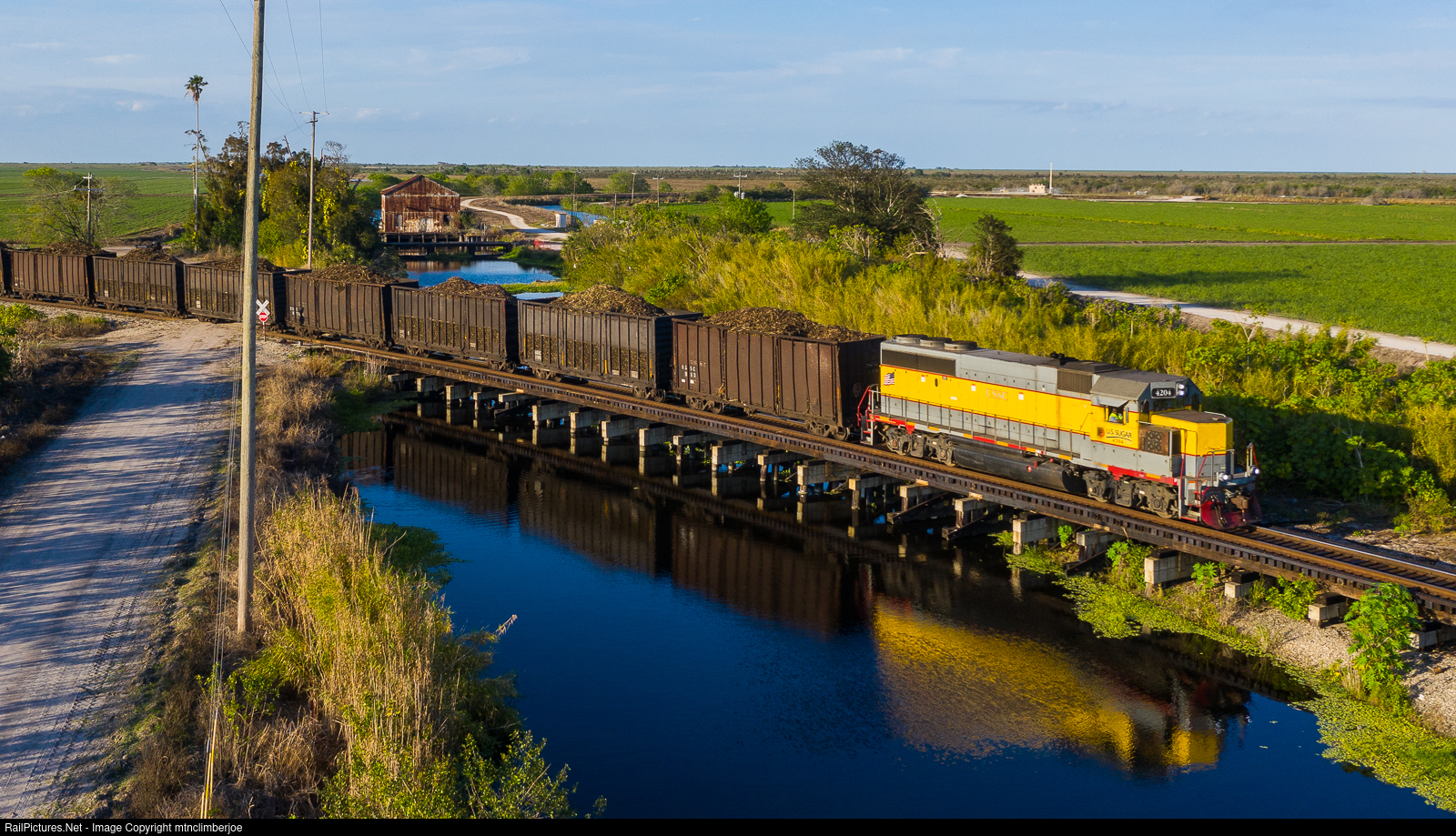 | After swapping blocks of cars with another job at the siding east of Moore Haven, the South Central Florida Express Cane 1 job is approaching Clewiston, Florida with a train of loaded sugar cane cars bound for the mill. As the tracks approach town, they turn south and cross over one of the many irrigation canals that criss-cross the region. |