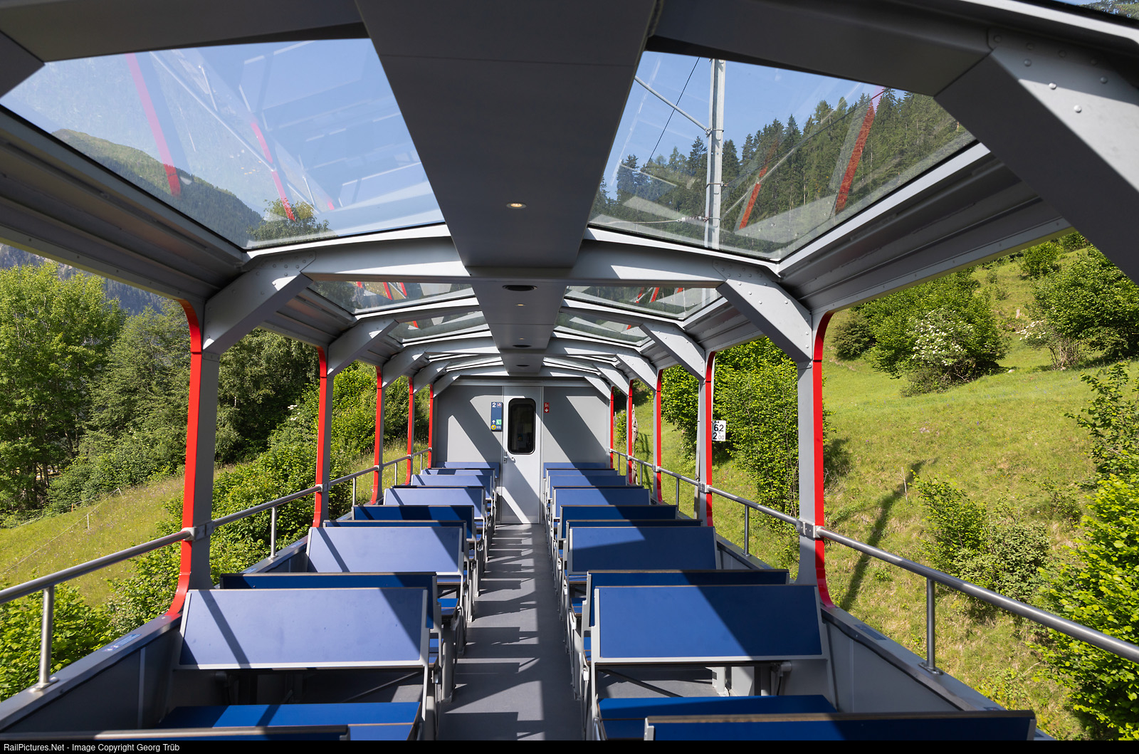 | In the new "Viaduktshuttle" push-pull train between Filisur and Alvaneu is the new open observation car B # 59401 with 60 seats. The car was rebuilt from the B # 2271 of 1987. The seat backs can be folded down so that passengers can sit facing the direction of travel. The "Viaduktshuttle" circulates every half an hour in summertime between Filisur and Alvaneu with a stop at the new "Schmitten GR Landwasserviadukt" station, from which the "Hennings" viewing platform above the Zalaint tunnel can be reached in a 5 minutes walk. |
