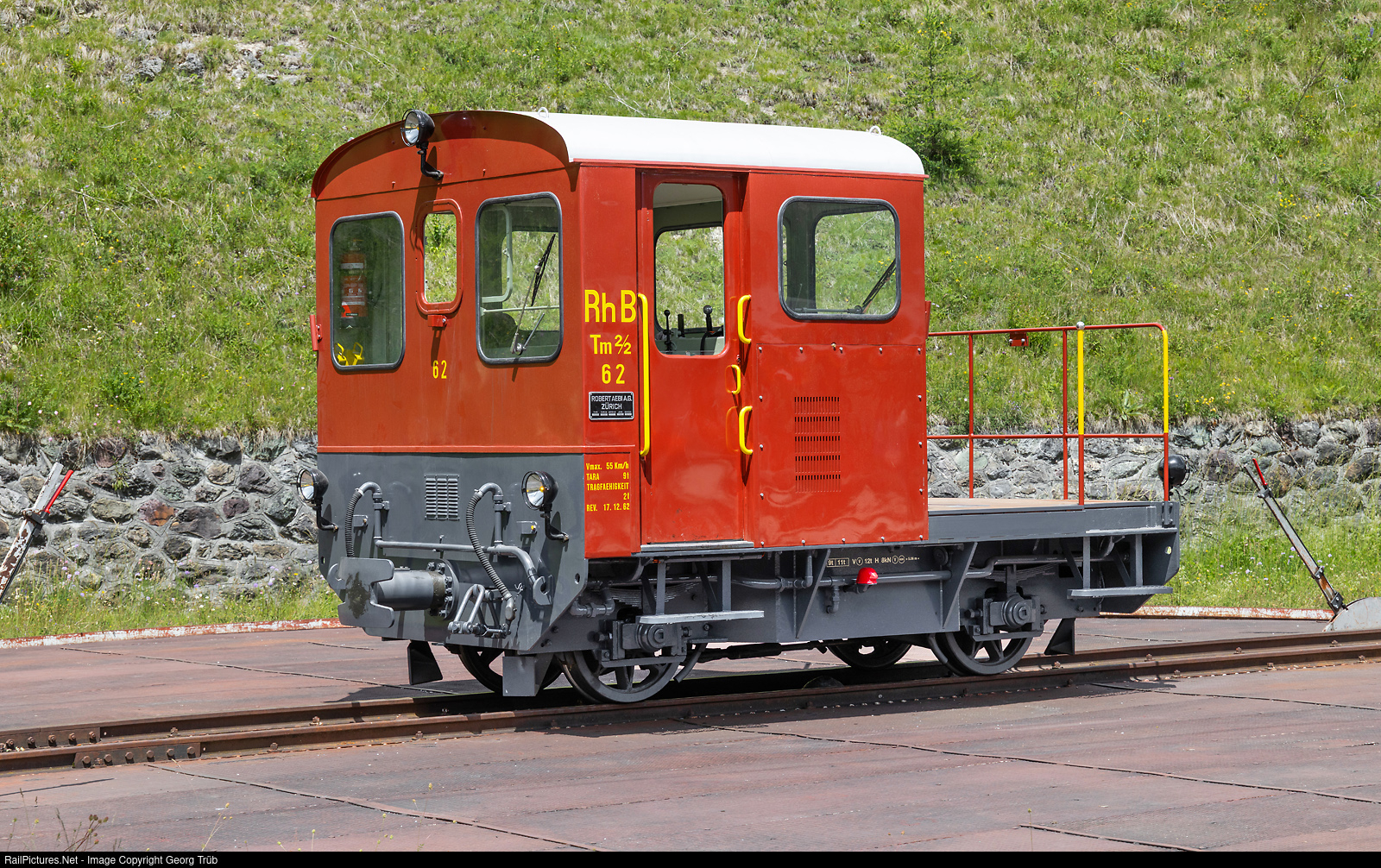 Diesel shunter Tm 2/2 # 62 of the Rhaetian Railway, rebuilt by members of association "Club 1889", on the turntable in Filisur. Built as Xm 2/2 # 9912 II in 1962 by Robert Aebi AG / SLM / RhB for the overhead wire maintenance.