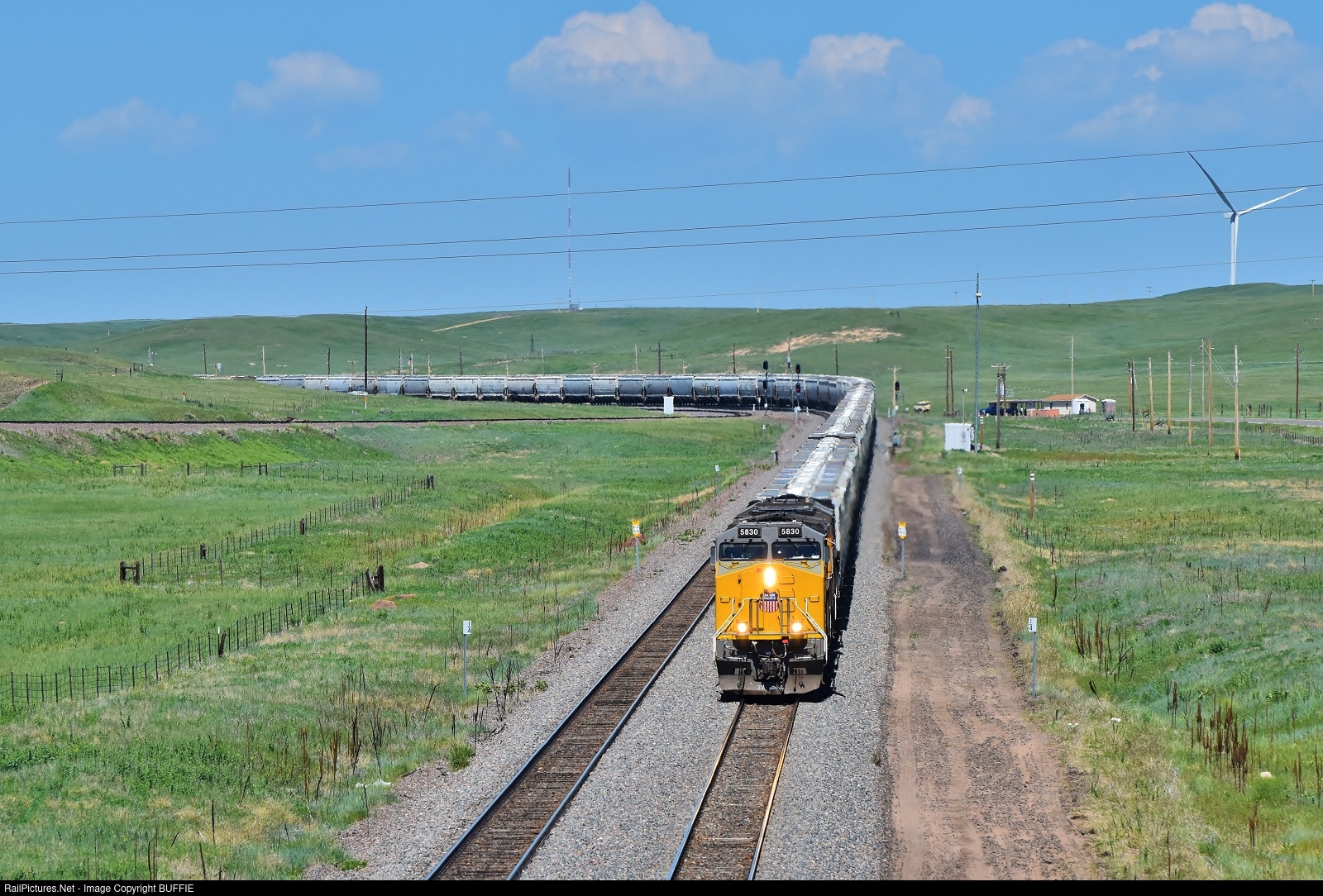 UP 5830 (ES44AC) leads a freight past the windmills west of Cheyenne, Wyoming.