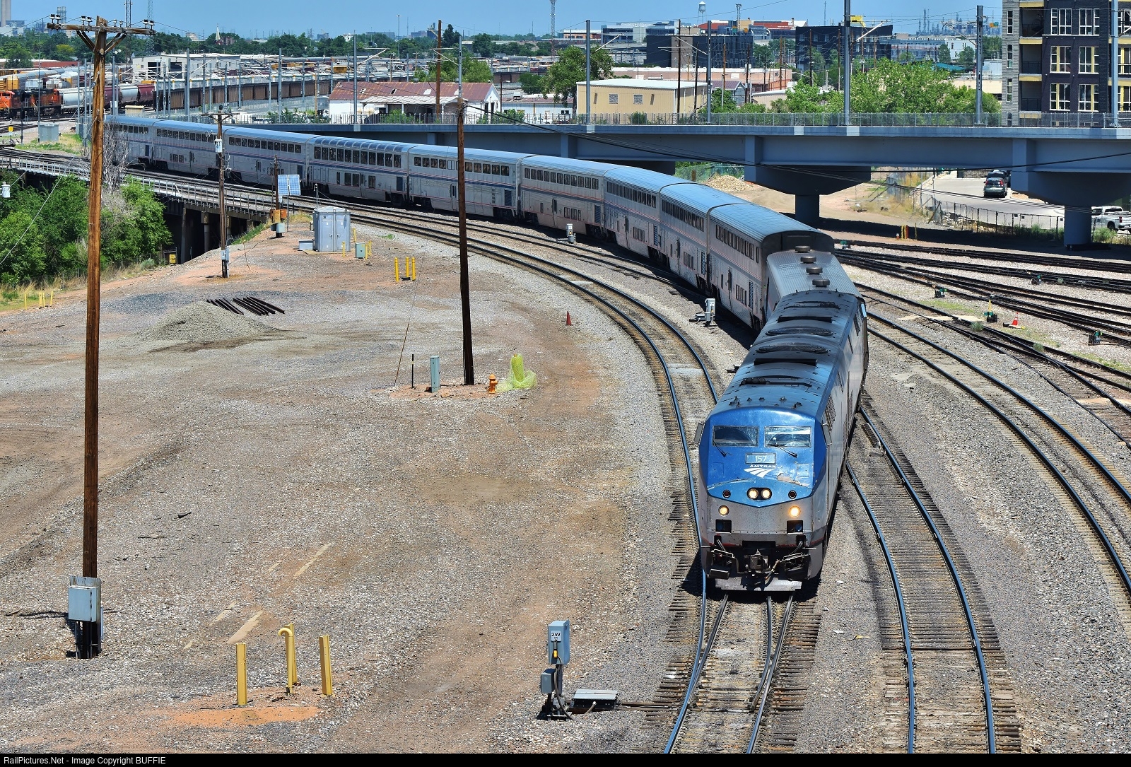 | Amtrak engine #157 (P42DC) runs through the BNSF yard in Denver, Colorado, after which it will back into Denver's Union Station.