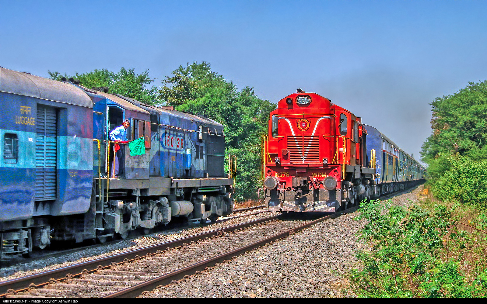 Alco WDM3a #16376 hauled 11040 Gondia Kolhapur Maharashtra Express crossing the alco WDM3a #16013 Kolhapur Nizamuddin Express at Nandre. Now this section is completey doubled and electrified. Maharashtra Express is a longest distance covering train in the state of Maharashtra. The loco pilot can is seen exhanging the flag. In Indian Railways, the exchange of hand signals, primarily with green and red flags, is a crucial safety procedure. It's known as the "All Right Signal" and is used to confirm that a train is clear to proceed or to stop, and that all systems are go.