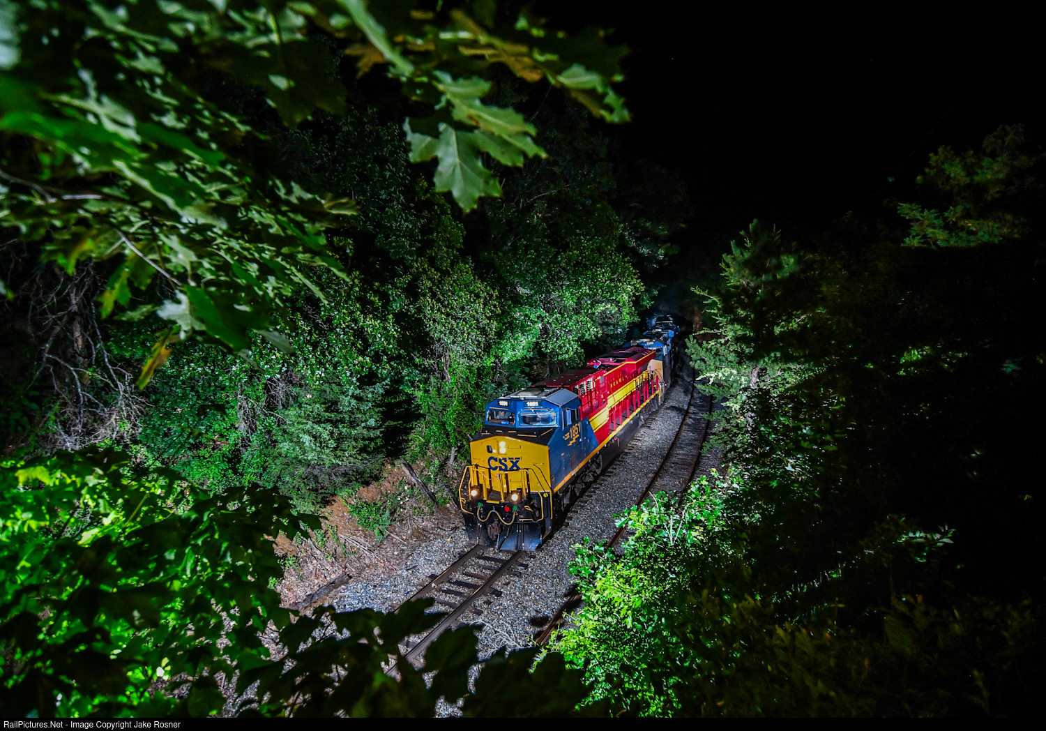 CSX G780, a combined coal/grain train breaks the silence of the night as it struggles to climbs Afton Mountain with a massive train. CSX 1851, the NC&STL heritage unit leads the way.