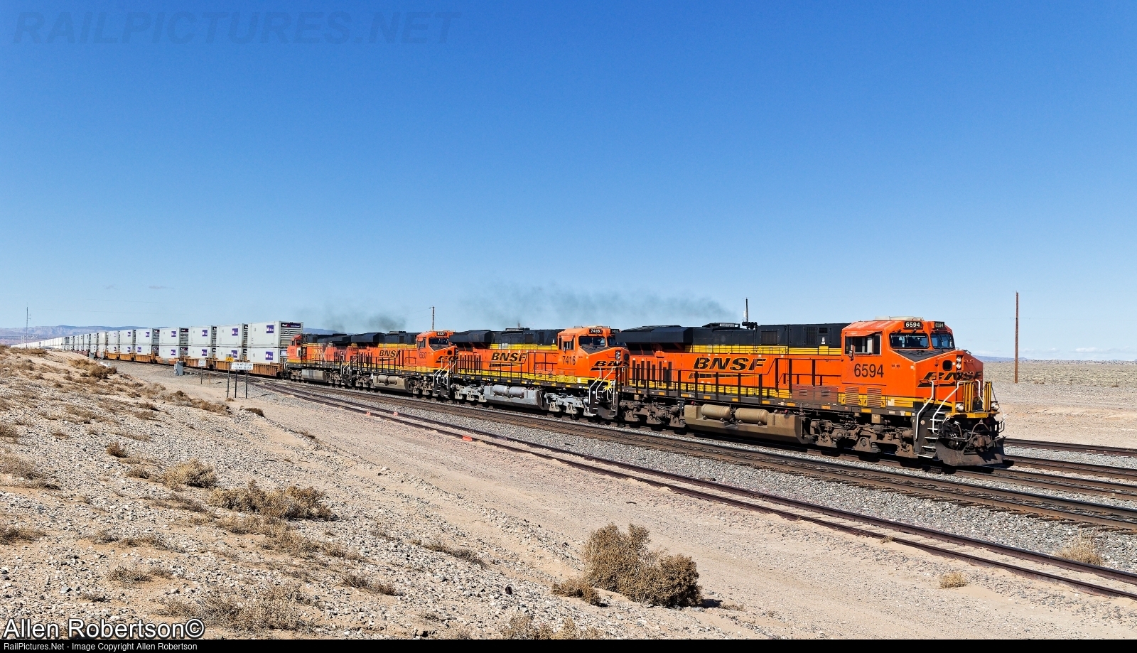 | BNSF 6594, 7416, 6537, & 4680 with eastbound stacks at Dalies, New Mexico. |
