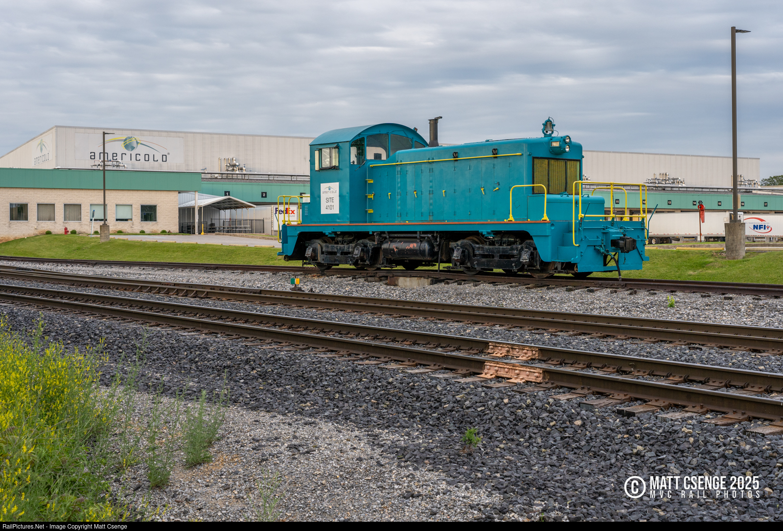 Outside the Americold facility in Chambersburg, PA rests SW1 locomotive no. 8411, sporting a seemingly fresh coat of dark turquoise paint. Originally built as B&O 211. |