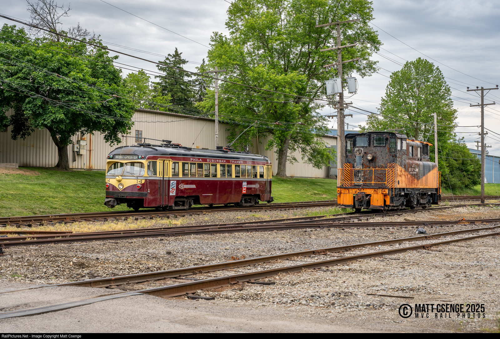 Suburban Steel. Philadelphia Suburban Transportation Co. trolley 14 is seen en-route back to the car house, passing ARMCO Steel locomotive B-73. The unusual locomotive was built by the Baldwin Locomotive Works in 1930, and now is used occasionally to move standard gauge equipment at the Pennsylvania Trolley Museum.
