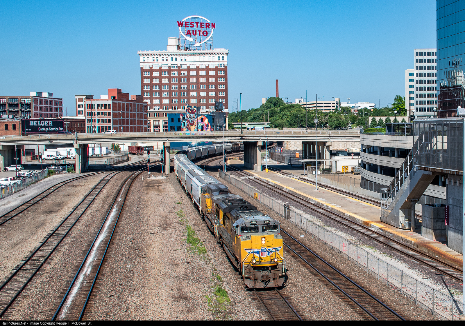 | With Amtrak departed, UP open the floodgates and sent unit train after unit train down the KCT to 18th St Yard. Here's a grain train heading west towards the high line towards Kansas. |