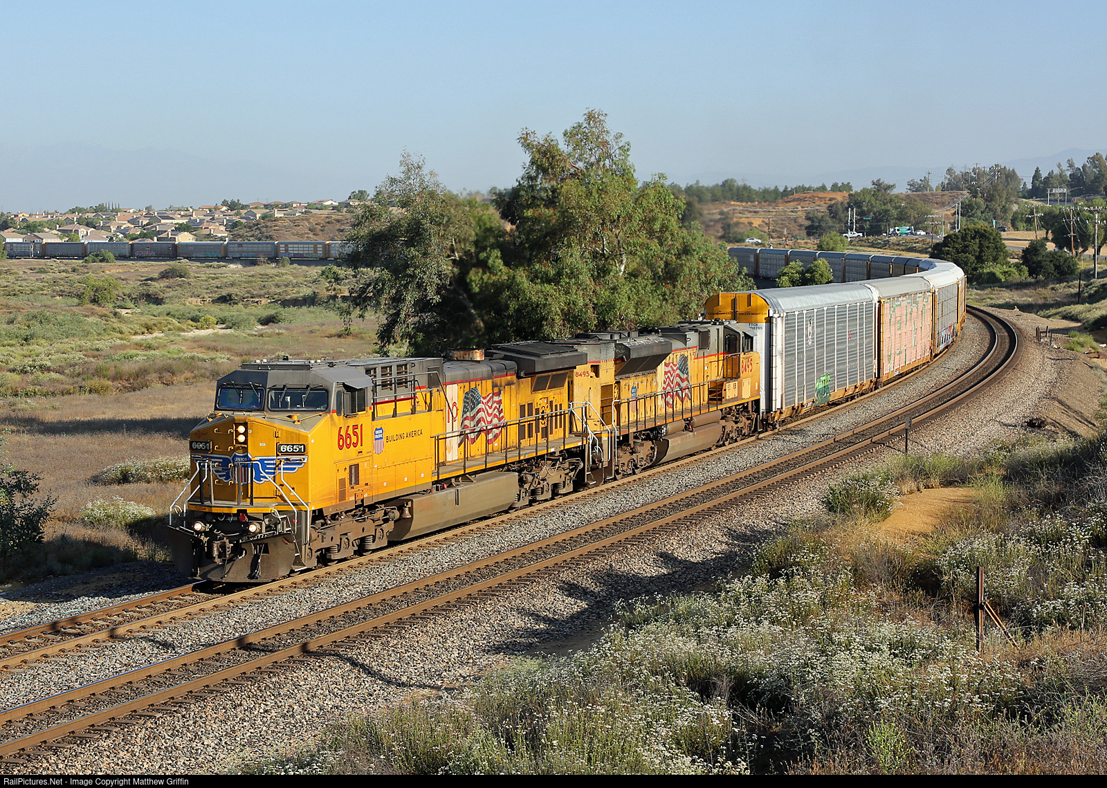 Early morning at the big curve in Beaumont finds an eastbound auto train lead by UP 6651.