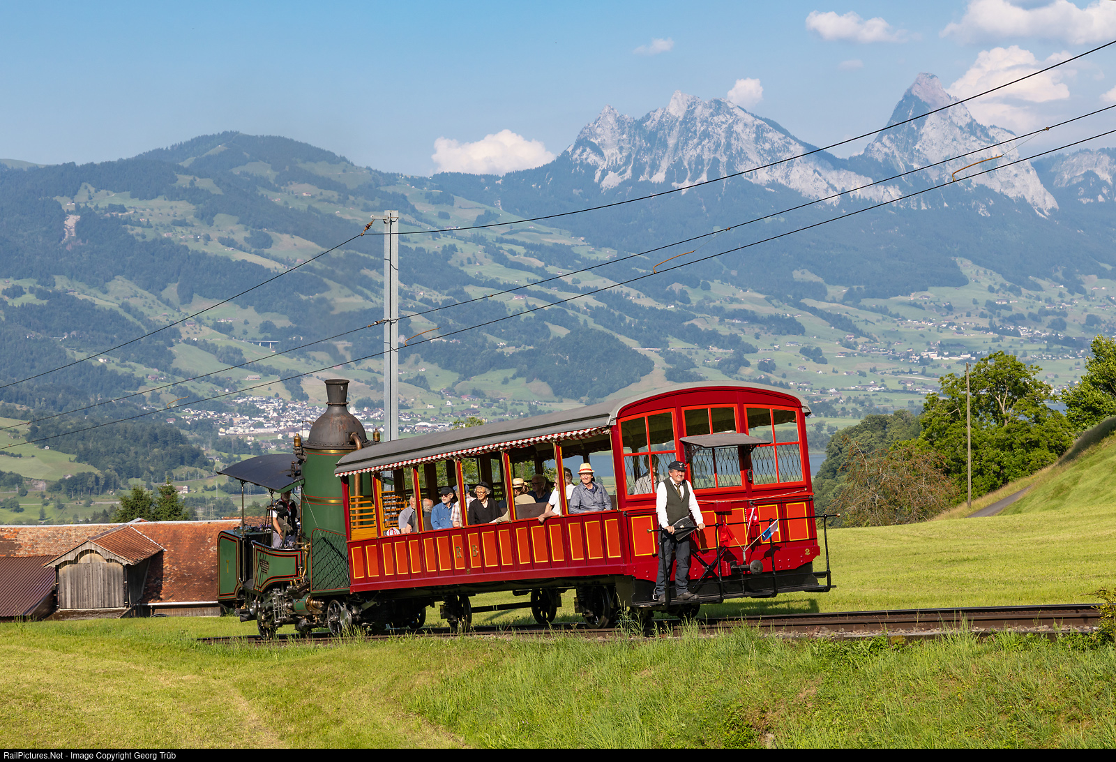| The H 1/2 # 7 cogwheel steam locomotive of the former Rigi Railway, built by SLM in Winterthur in 1873 and owned by the Swiss Museum of Transport (VHS), is running on a special train between Arth Goldau and Kräbel, with the Mythen mountains in the background. The B # 2 carriage is the oldest original vehicle of the Rigi Bahnen, built in 1871 in the SCB workshop in Olten for the opening of Europe's first rack railway. This was a F.G and F.S. photo ride.