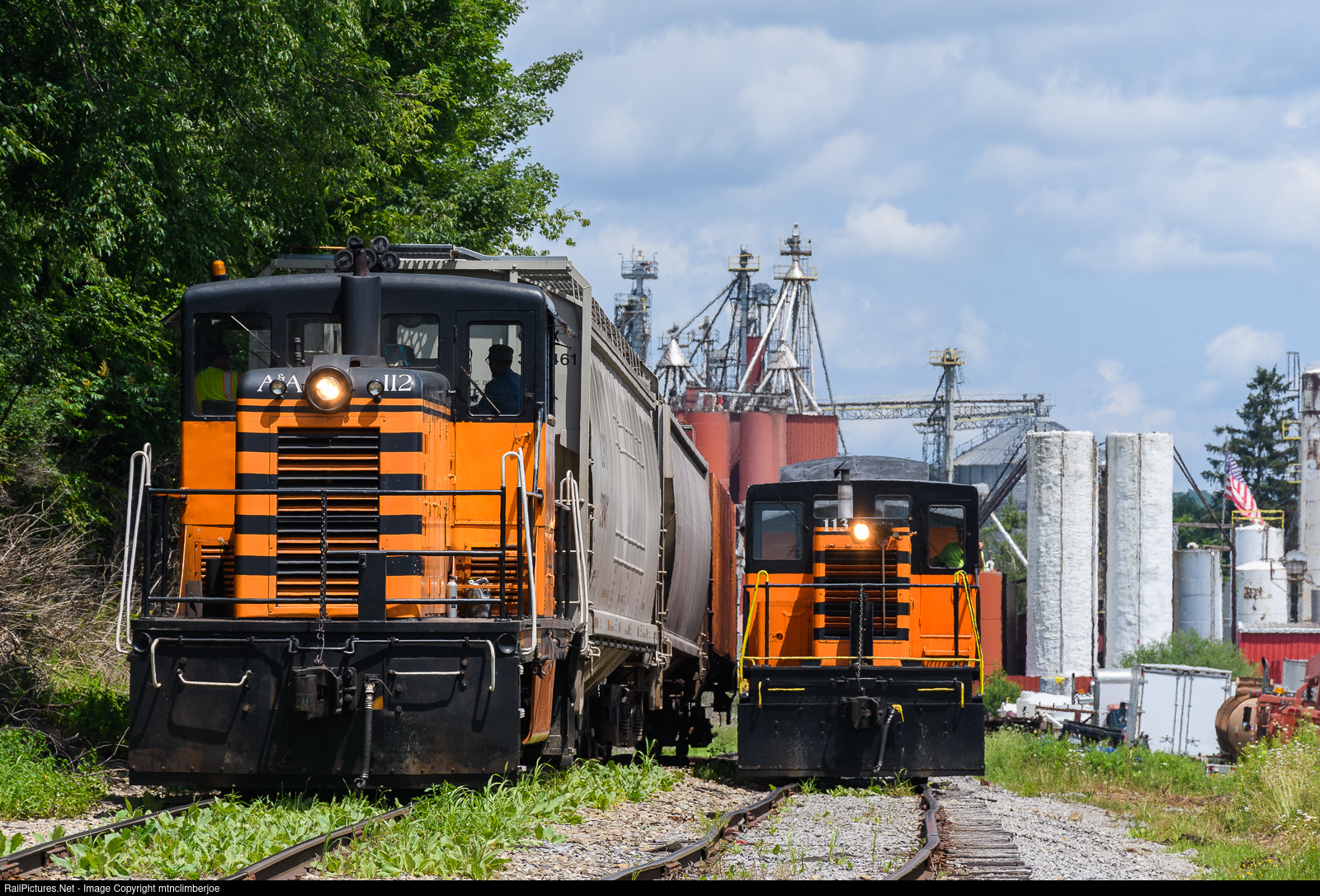 | A pair of Arcade & Attica trains are meeting at the siding in North Java, New York at the north end of the railroad's main line. On the left, 65 Tonner 112 has three covered hoppers to spot at Reisdorf Bros Inc. in the background. On the right, 80 Tonner 113 has a pair of passenger cars in tow from the excursion fleet. |
