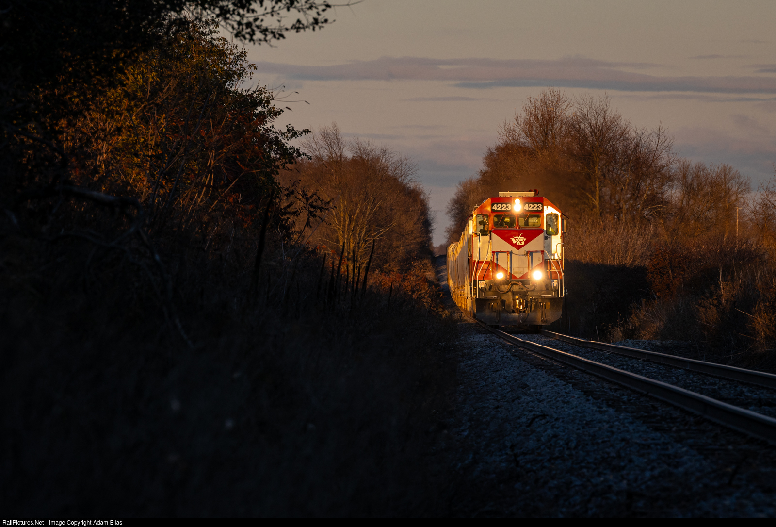| WAMX 4223, WSOR's SD45 body leading its train from Oshkosh into its destination of Ripon in the very very final sun-rays of the day. |