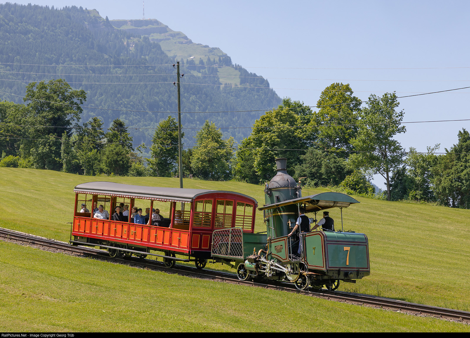 | The H 1/2 # 7 cogwheel steam locomotive of the former Rigi Railway, built by SLM in Winterthur in 1873 and owned by the Swiss Museum of Transport (VHS), is running on a special train between Arth Goldau and Kräbel, with the Rigi Kulm in the background. The B # 2 carriage is the oldest original vehicle of the Rigi Bahnen, built in 1871 in the SCB workshop in Olten for the opening of Europe's first rack railway. This was a F.G and F.S. photo ride. |