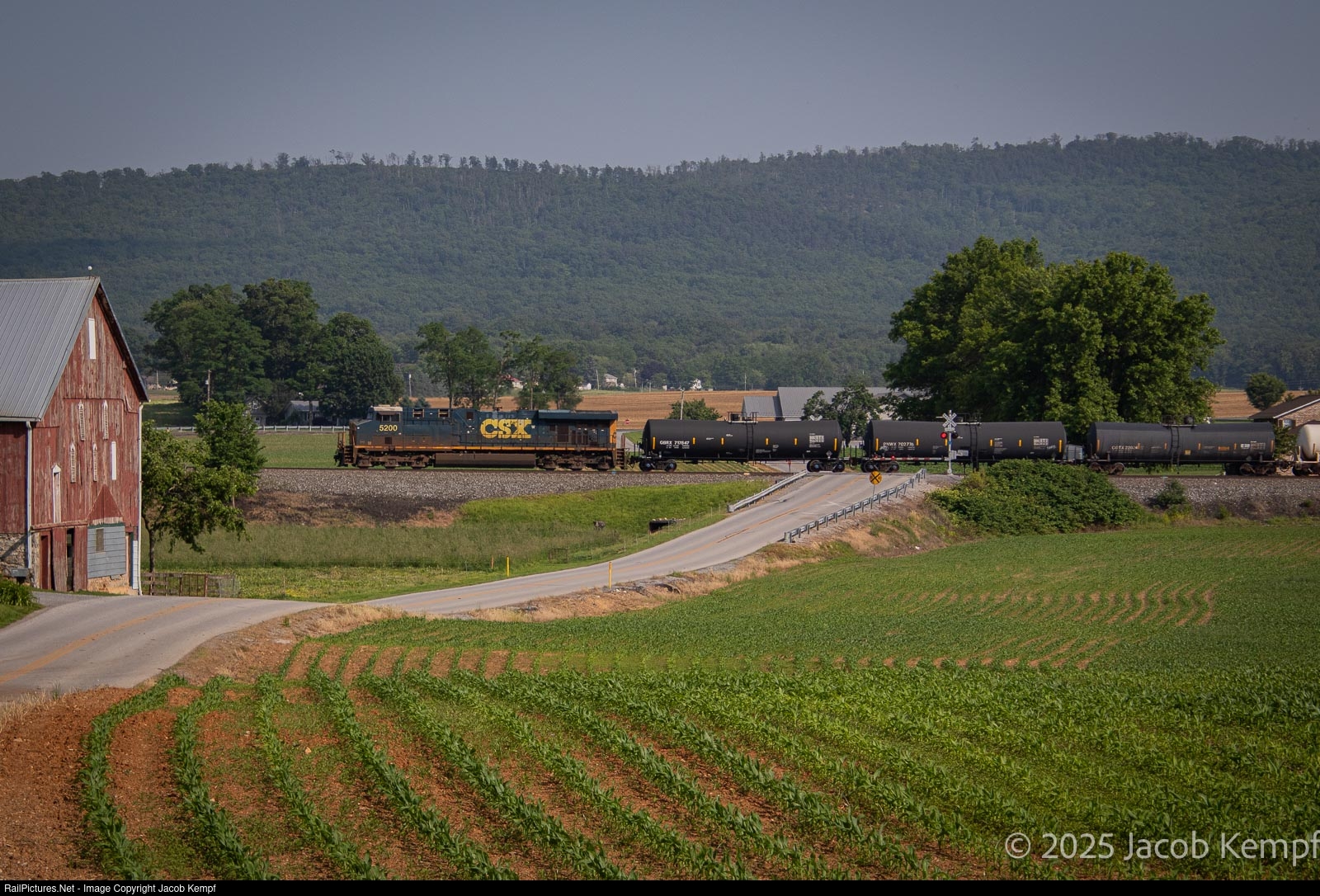 With CSX's Howard Street Tunnel project underway, the railroad worked out an agreement with Norfolk Southern to run two pairs of trains each direction along portions of the Harrisburg Division across Pennsylvania. Initially electing to run a pair of manifest trains and a pair of coal trains, the decision to end the coal trains came early on in the rerouting process, with a second pair of manifest trains added to the rotation. Symboled M409 and M410, the trains operated between Selkirk, NY and Waycross, GA, running in a 1X1 configuration to expedite transitioning from the CSX Cumberland Sub, to the Lurgan Sub up to Hagerstown, MD. Westbound M409's DPU, CSX 5200, shoves the train through the beautiful countryside of Cumberland County in the small village of Lee's Cross Roads, PA, just north of Shippensburg.