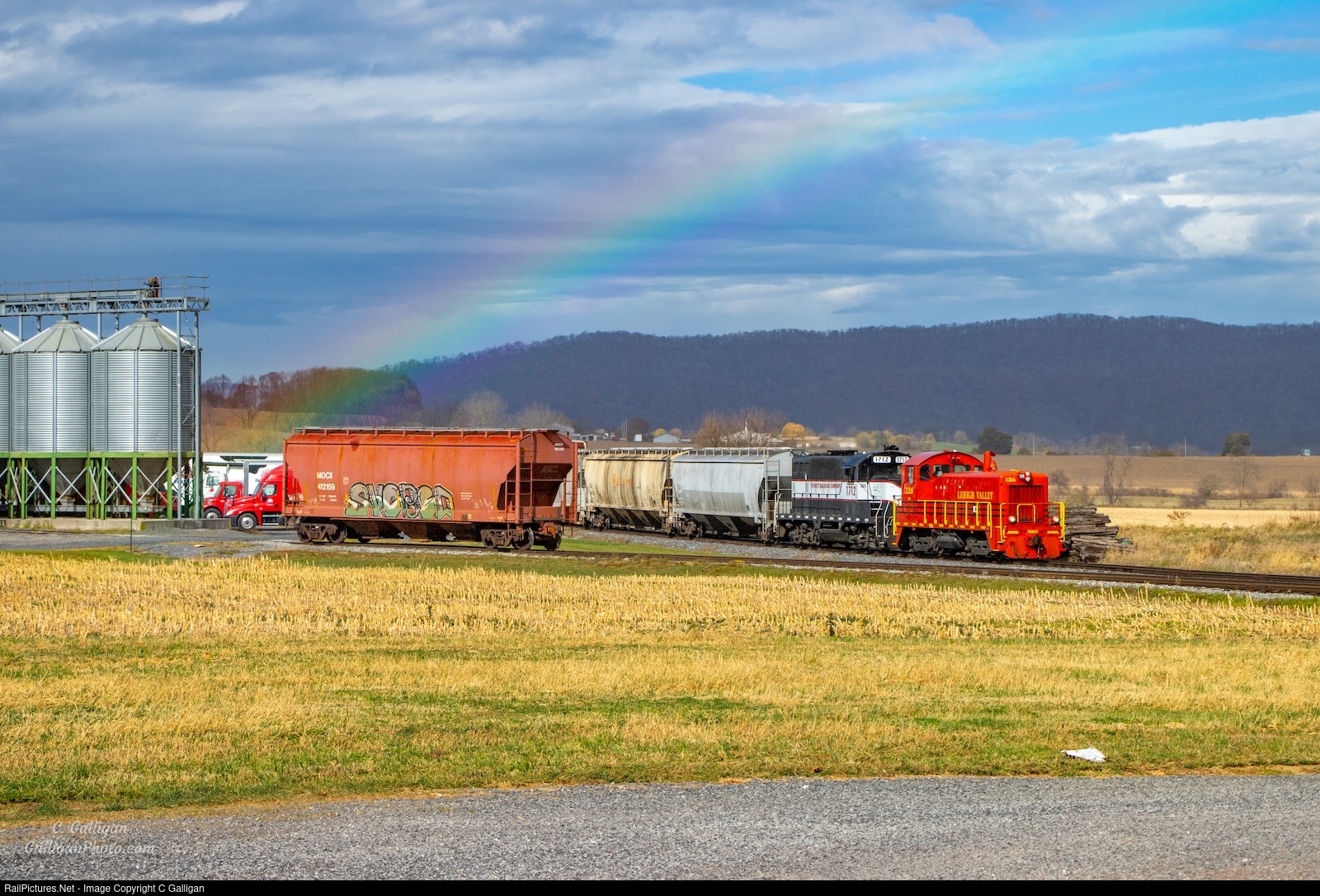 Everett Railroad's freight job works their way through Martinsburg, PA with former LV 126 in the lead, presenting itself as the pot of gold at the end of a fading rainbow.