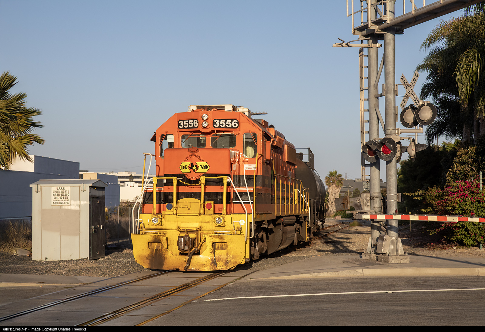 | Rail Link Chevron switcher behind DGNO GP38-2 No. 3556 shoves a cut of tank cars across Pacific Coast Highway in El Segundo, CA, on a Sunday afternoon. |