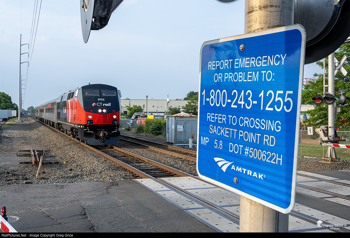 On the evening of June 13th, 2025, southbound CTrail train 4463, led by CTDX GE P40BH 6702, passes the Sackett Point Road grade crossing on the MRS (Hartford) Line in North Haven, Connecticut. CTrail recognizes ENS Sign Awareness Day, observed on June 24, which highlights the importance of the blue and white Emergency Notification System signs posted at every railroad crossing. These signs display a unique crossing ID number and a toll-free emergency phone number, allowing the public to quickly report hazards such as stuck vehicles or malfunctioning gates so railroads can respond immediately to prevent accidents.