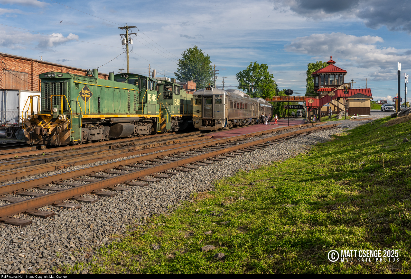 Return to Reading. Reading, Blue Mountain & Northern (RBMN) RDCs 9166 (RDC-3, phase II) and 9168 (RDC-1, phase I) have just returned to Reading Outer Station with an excursion to and from Jim Thorpe. On the far track freight power idles away, including MP15DC no. 1542 and SW1500 no. 1546.