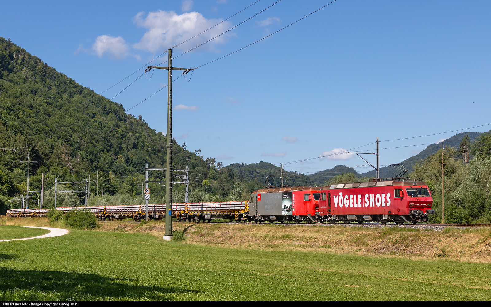 | The two former Südostbahn locomotives Re 456 # 094 (Vögele Shoes) and # 095 (100 years of the Romanshorn-St. Gallen-Wattwil-Uznach line), now registered with DSF (Depot- und Schienenfahrzeuge Koblenz), are operating in multiple control for the Oensingen-Balsthal-Bahn (OeBB) railway company on behalf of the construction company Vanoli with a freight train in the Laufental valley. The new concrete ties being transported are intended for the double-track expansion between Duggingen and Grellingen. Train 69445 is traveling from Delémont to Zwingen and can be seen between Soyhières and Liesberg.