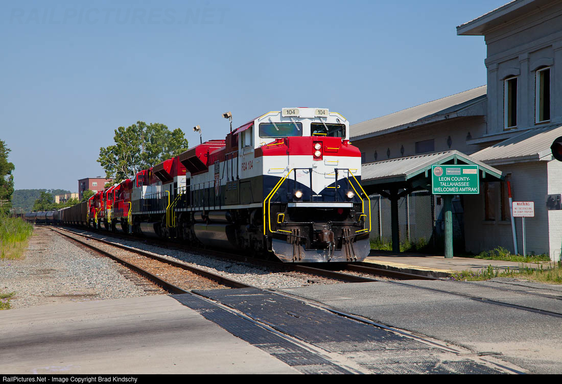 | With a pair of freshly painted former FEC SD70M-2s, pulling three dead-in-tow RJ Corman SD40-2s, the TA-EAST passes an outdated sign welcoming Amtrak to Tallahassee Union Station. A $3.5MM project to renovate the station is underway. |