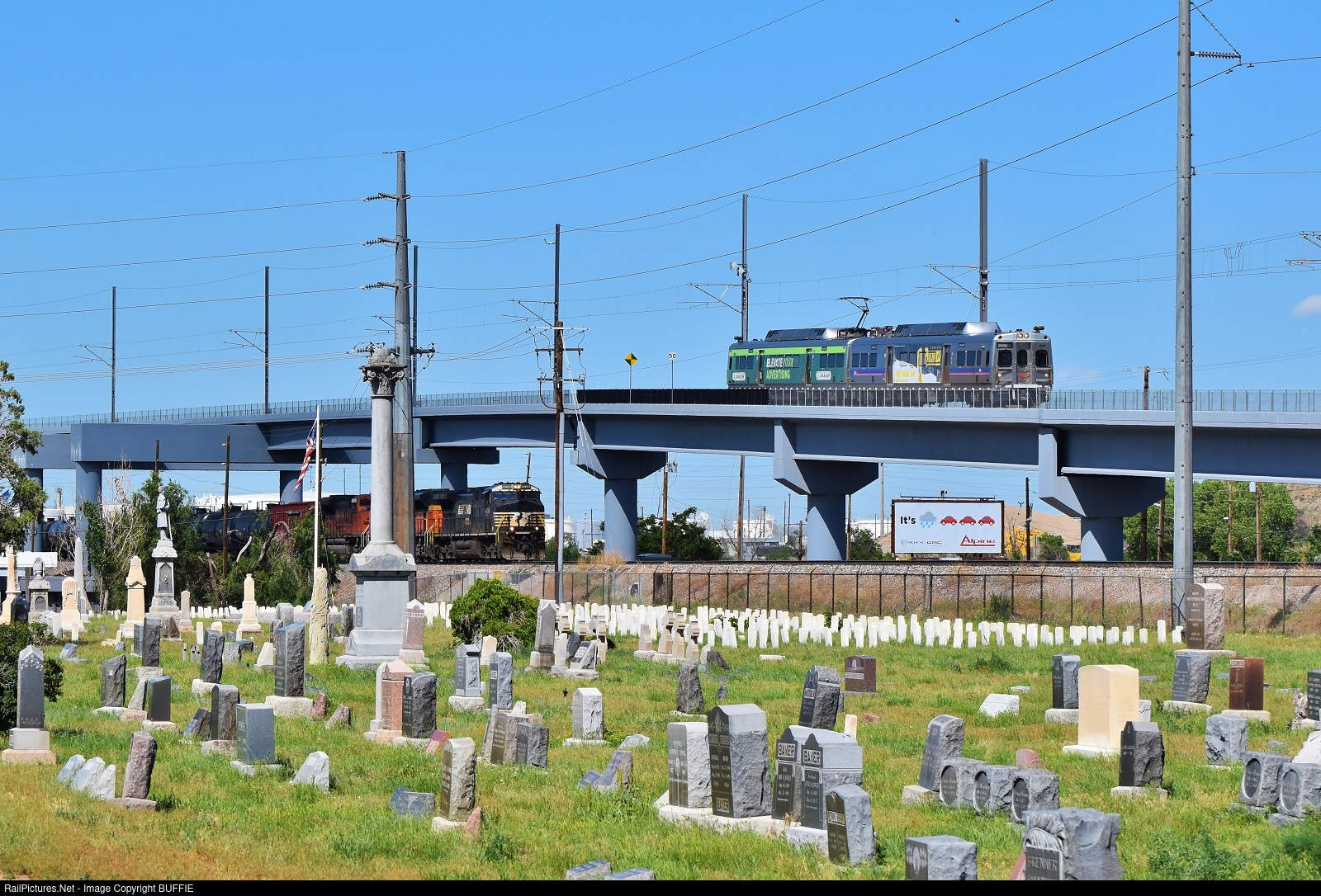 NS 4130 (AC44C6M) and an RTD commuter train run past the Riverside Cemetary in Denver, Colorado.