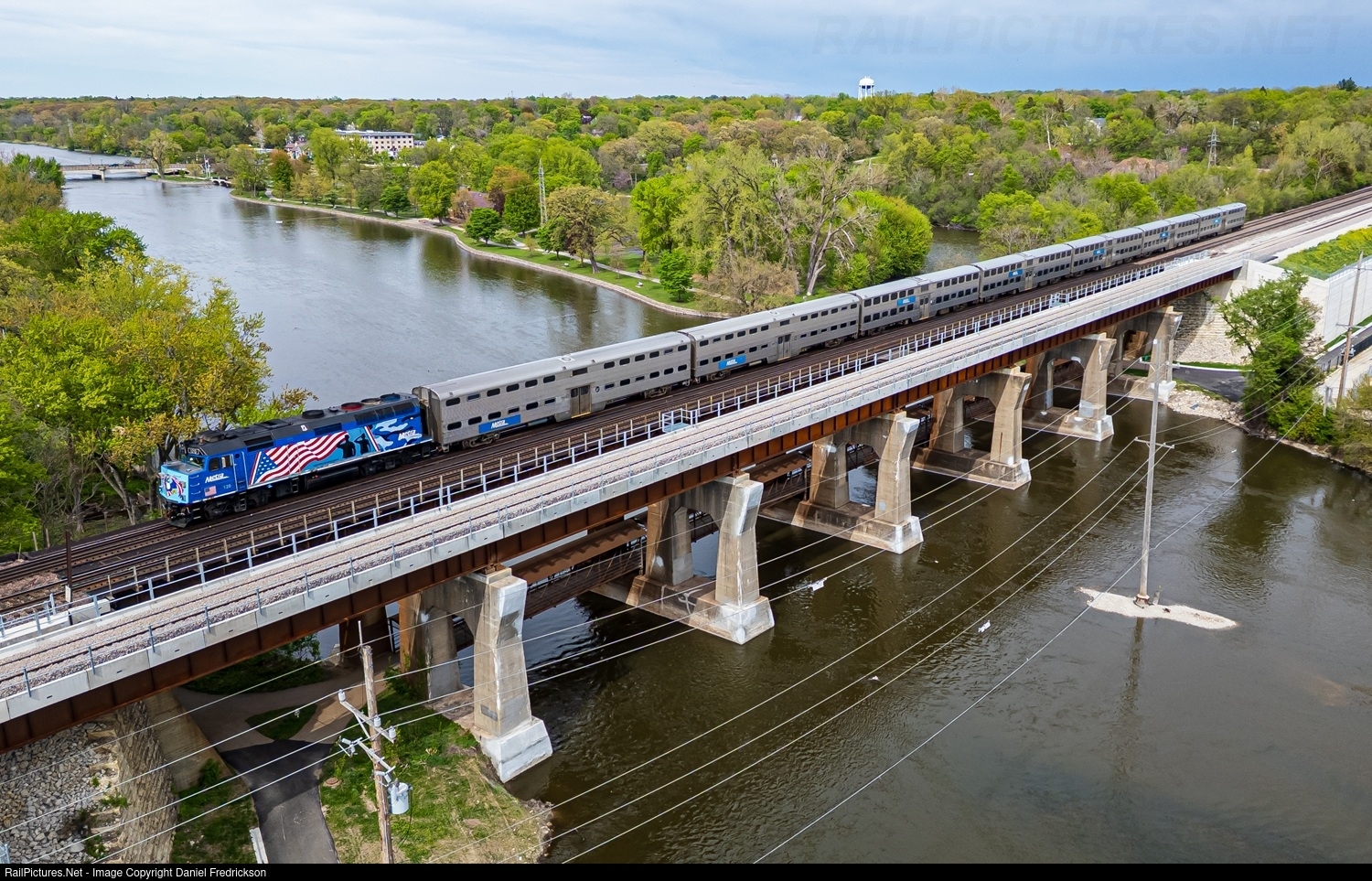 Metra UP-W train #507 rumbles over the Fox River in Geneva, IL with the Veterans tribute unit, F40PH-3 #120, on point. The new third track span across the existing piers is looking really impressive as work nears completion on this portion of its addition.