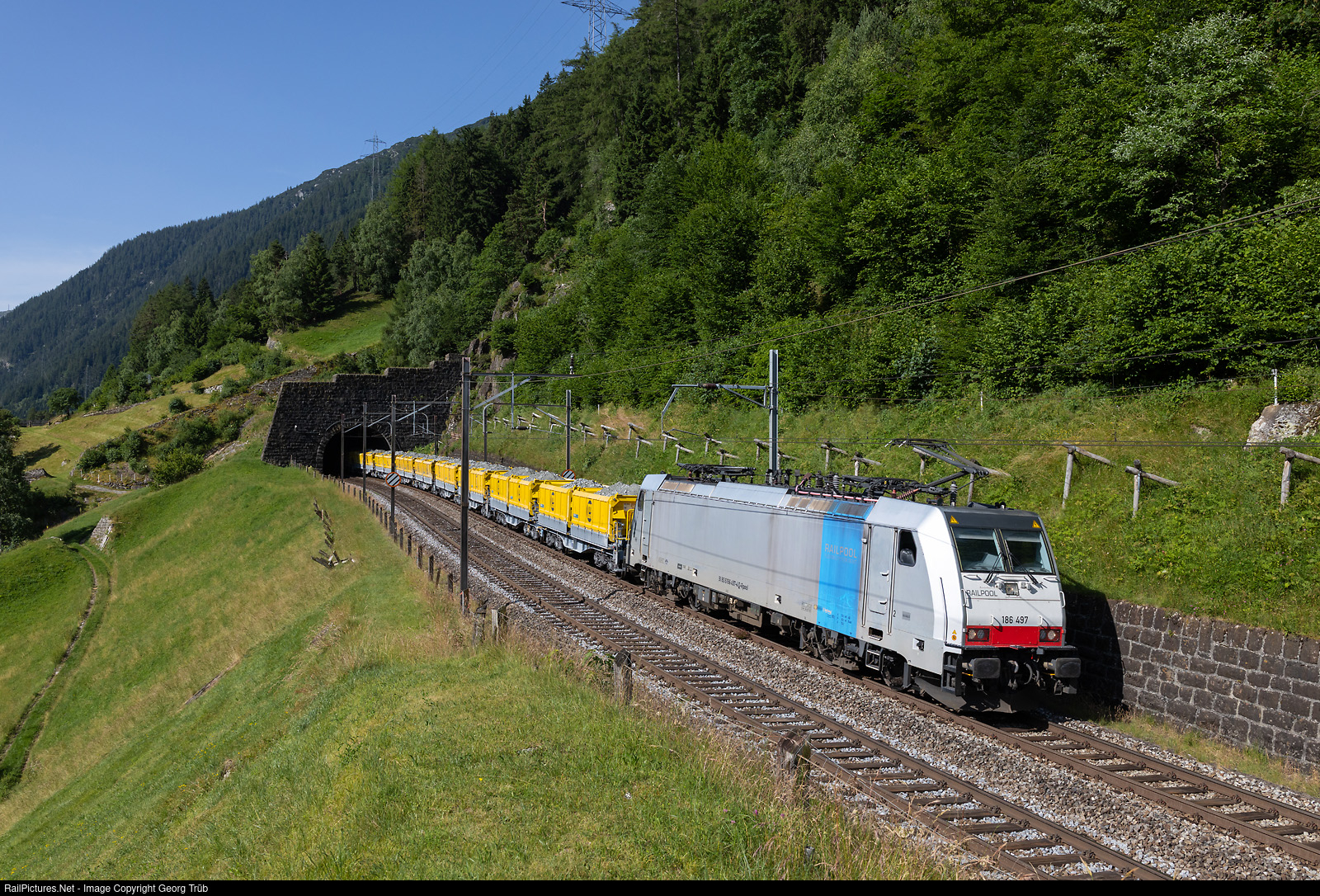 | Some of the excavated material from the construction of the second tunnel tube for the motorway tunnel between Göschenen and Airolo is transported by freight train to Flüelen and deposited in Lake Urnersee (part of Lake Lucerne) to create shallow water zones. Bombardier TRAXX F140 MS 186 # 497 of Railpool, rented to TR TransRail, pulls the loaded train 67654 with 8 double VTG Sggrrs cars with 32 "Marti" containers from Airolo to Flüelen, between Göschenen and Wassen. Train load was 1420 ton. |