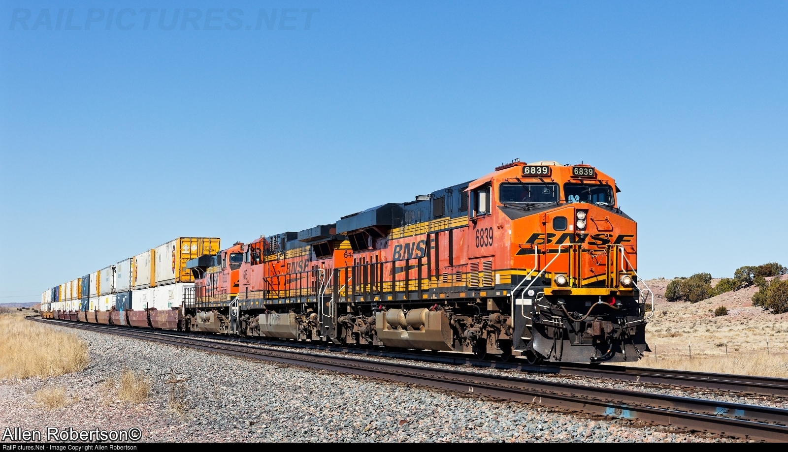 | BNSF 6839, 613, & 6333 with eastbound stacks. |