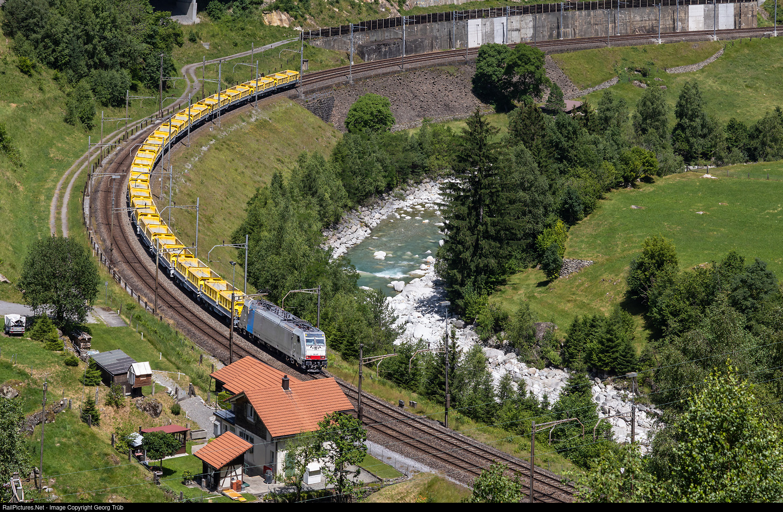 | Some of the excavated material from the construction of the second tunnel tube for the motorway tunnel between Göschenen and Airolo is transported by freight train to Flüelen and deposited in Lake Urnersee (part of Lake Lucerne) to create shallow water zones. Bombardier TRAXX F140 MS 186 # 497 of Railpool, rented to TR TransRail, pulls the empty train 67673 with 8 double VTG Sggrrs cars with 32 yellow "Marti" containers from Flüelen to Göschenen through the Wattinger curve between Gurtnellen and Wassen. |