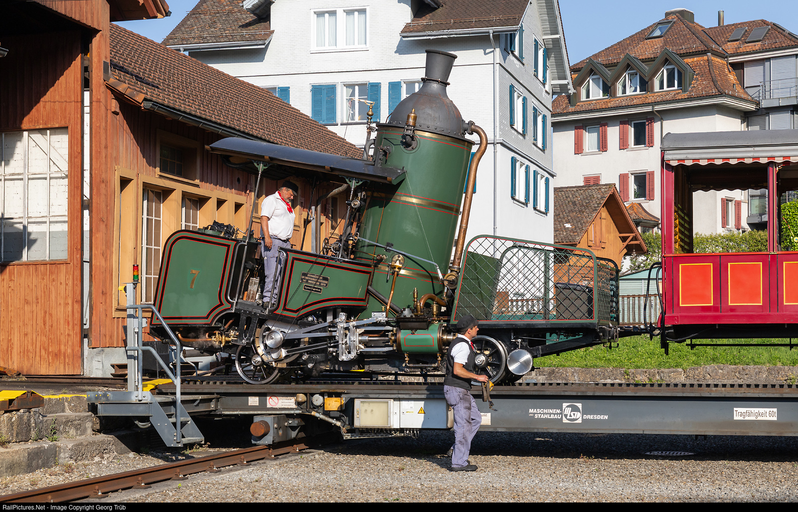 | The H 1/2 # 7 cogwheel steam locomotive of the former Rigi Railway, built by SLM in Winterthur in 1873 and owned by the Swiss Museum of Transport (VHS), is back in Arth Goldau after the photo charter to Rigi Kulm. Engineers Martin H. and Paul G. are to run the locomotive into the shed. |