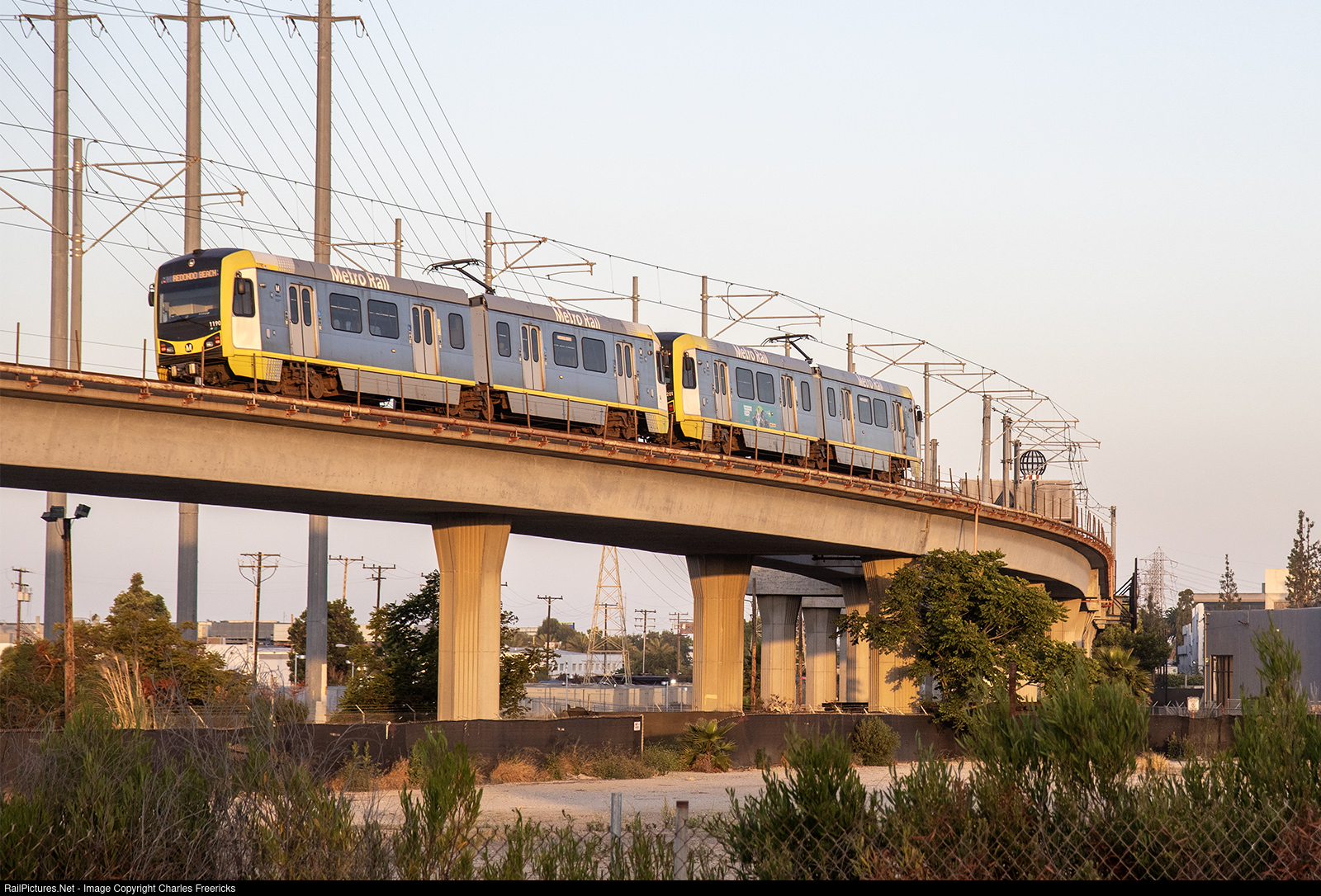 | A Metro Rail K Line train that originated at Crenshaw and Expo heads over a railroad wye on the BNSF Harbor Sub on its way to Redondo Beach. The K Line is an amalgamation of the originally planned K/Crenshaw Line from Crenshaw to LAX and the old C/Green Line section from Aviation to Redondo Beach. |